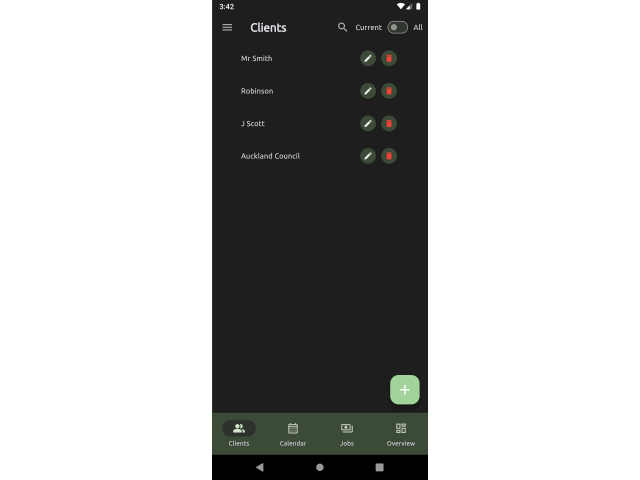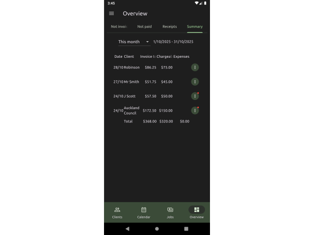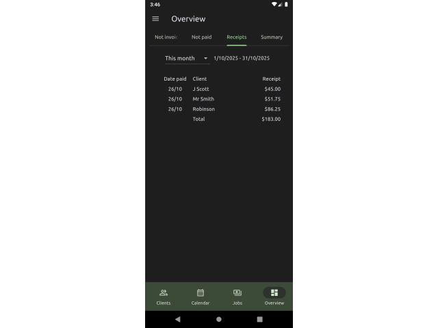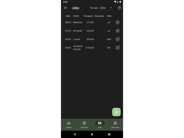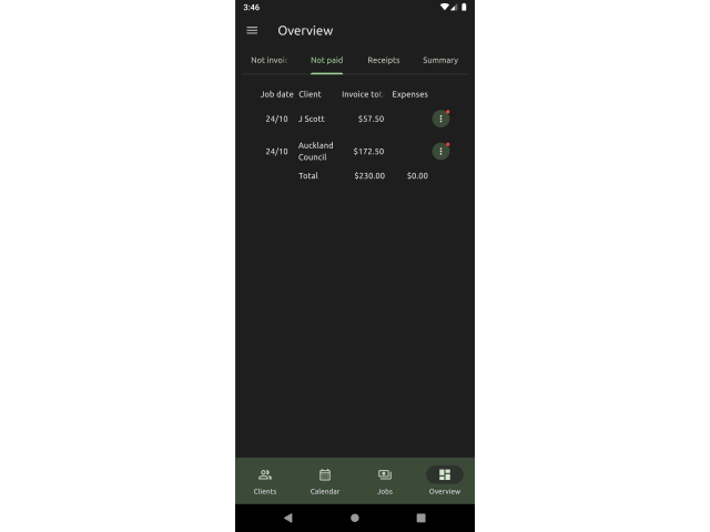 An optional calendar allows you to schedule regularly repeating jobs, such as a lawn mowing round, and see the expected total hours or amount for each day, and a list of the scheduled tasks for a specific day.