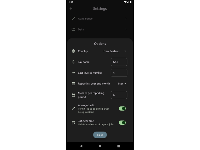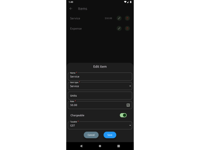 Invoice assistant supports multiple rates of GST/VAT with the rate able to be selected for individual chargeable items.